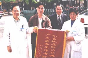 2003年4月26日,本公司與共青團南京市委、南京市青年聯(lián)合會組織部分青年代表帶著全市青年的心愿,向廣大奮斗在抗非典一線的醫(yī)務工作者送去錦旗和慰問品,表達對奉獻者真摯的祝福。在江蘇省人民醫(yī)院,當院領導和醫(yī)護人員從團市委書記許宏和圣和藥業(yè)董事長王勇手中接過錦旗和慰問品時深為感動。他們表示有全市人民的大力支持,一定能戰(zhàn)勝“非典”惡魔,奪取抗非典戰(zhàn)斗的勝利。許宏書記和王勇董事長對奮戰(zhàn)在抗非典一線的醫(yī)務人員所表現(xiàn)出的崇高精神表示欽佩,對他們所做的工作表示感謝,并囑咐他們一定要保重身體。