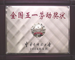 2004年4月29日,江蘇省總工會(huì)在南京召開紀(jì)念“五一”國(guó)際勞動(dòng)節(jié)大會(huì),會(huì)上,省委領(lǐng)導(dǎo)向王勇董事長(zhǎng)頒發(fā)了“全國(guó)五一勞動(dòng)獎(jiǎng)狀”獎(jiǎng)牌。