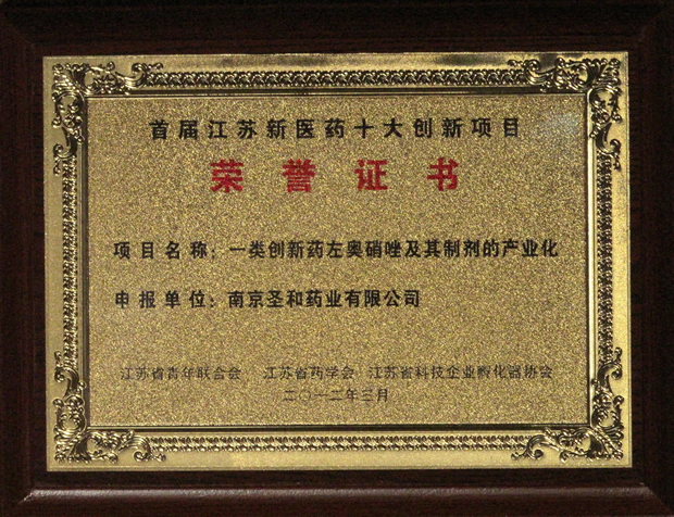 2012新醫(yī)藥十大科技創(chuàng)新項(xiàng)目榮譽(yù)證書