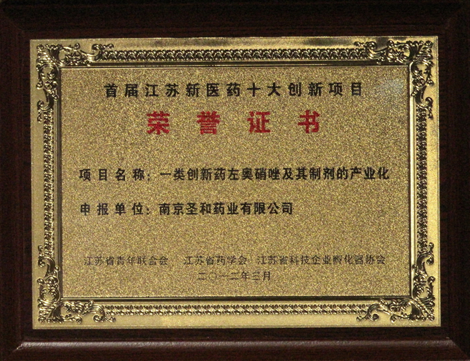 為了深入實施科教興省和人才強省戰(zhàn)略,促進新醫(yī)藥等六大新興產(chǎn)業(yè)的發(fā)展,發(fā)現(xiàn)和凝聚一批青年創(chuàng)新創(chuàng)業(yè)領(lǐng)軍人才,江蘇省青年聯(lián)合會、江蘇省藥學(xué)會、江蘇省科技企業(yè)孵化器協(xié)會聯(lián)合在全省范圍內(nèi)開展了首屆江蘇新醫(yī)藥科技創(chuàng)新創(chuàng)業(yè)項目大賽暨青年科技領(lǐng)軍人才舉薦活動。目前,我司申報的“一類創(chuàng)新藥左奧硝唑及其制劑的產(chǎn)業(yè)化”項目,被授予“首屆江蘇新醫(yī)藥十大創(chuàng)新項目”榮譽稱號。