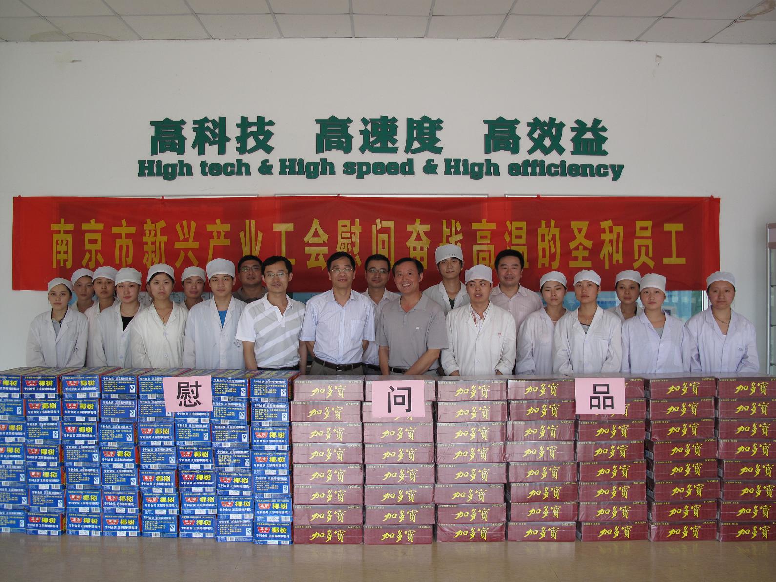 本網(wǎng)訊 7月24日,夏日炎炎,南京市新興產(chǎn)業(yè)工會(huì)郎岳主席一行三人在集團(tuán)工會(huì)主席戚良猛同志的陪同下,冒著酷暑來(lái)到我司新港生產(chǎn)基地,慰問(wèn)奮戰(zhàn)在生產(chǎn)一線(xiàn)的廣大職工,為一線(xiàn)職工送上了防暑降溫慰問(wèn)品,給職工們帶來(lái)了清涼和關(guān)懷。