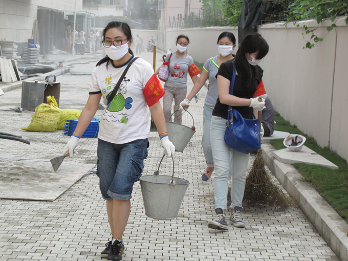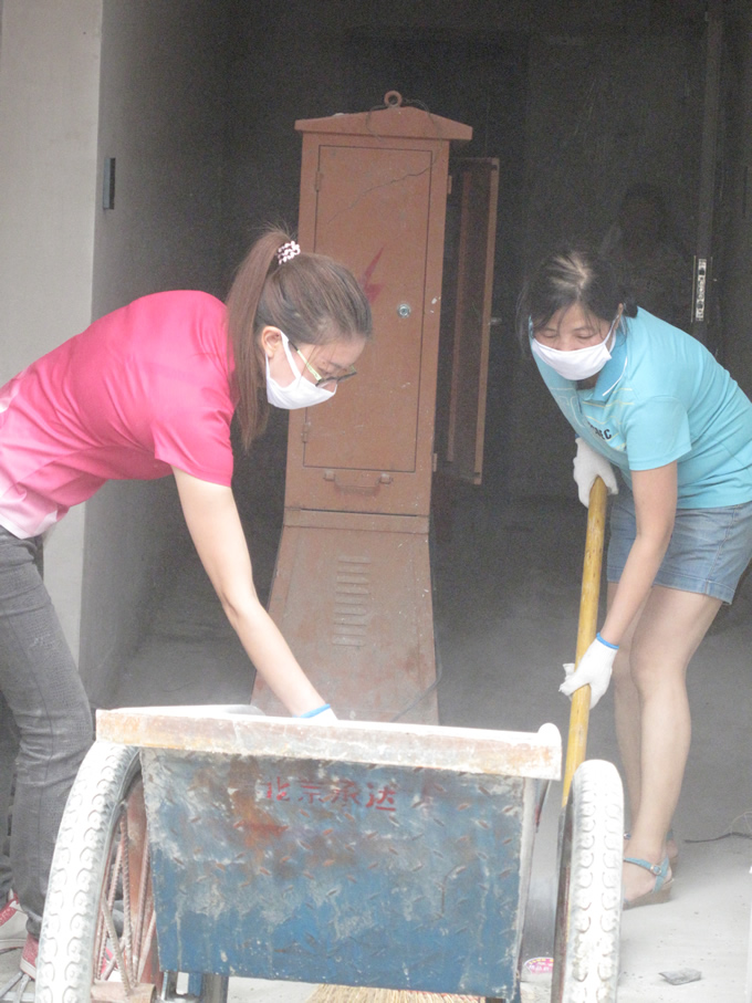 為使志愿工作井然有序、效率提升,組織方圣和置業(yè)公司將志愿者分組編隊,明確了各組的勞動任務(wù),并向每位志愿者提供了袖章、口罩、手套,以及鐵鍬、大小掃帚、小推車等勞動工具。盡管當天烈日當空,現(xiàn)場灰塵飛揚,但志愿者們?nèi)巳藵M懷激情,干勁十足,不怕臟、不怕累,許多人不一會兒就渾身濕透,但這些毫不影響大家的勞動熱情和干勁,因為在身體力行、揮汗如雨的激情里,圣和人體會到了為社會無私奉獻的快樂。為了讓下一代感受這份”愛和奉獻“,感受這份勞動的光榮,更有圣和員工志愿者帶著自己的孩子一起參與這項工作。此情此景不僅感染著所有的志愿者,也不時受到了路人們的稱贊。
