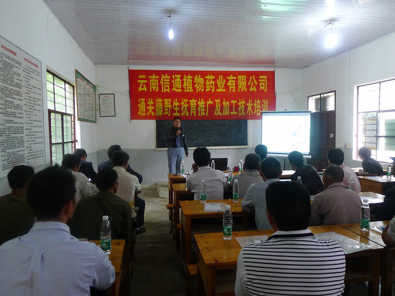 本網(wǎng)訊 8月25日,云南信通植物藥業(yè)有限公司生產(chǎn)技術(shù)部應(yīng)斗咀通關(guān)藤野生撫育基地負(fù)責(zé)人及當(dāng)?shù)剞r(nóng)戶邀請(qǐng),組織人員至云南文山州馬關(guān)縣進(jìn)行了通關(guān)藤野生撫育推廣及加工技術(shù)培訓(xùn)。培訓(xùn)會(huì)議得到了當(dāng)?shù)卣块T和農(nóng)戶的積極配合和大力支持,馬關(guān)縣科協(xié)主席及秘書,坡腳鎮(zhèn)書記,興隆村支書、村長(zhǎng),各村小組組長(zhǎng)、農(nóng)戶等近40人參加了培訓(xùn)。