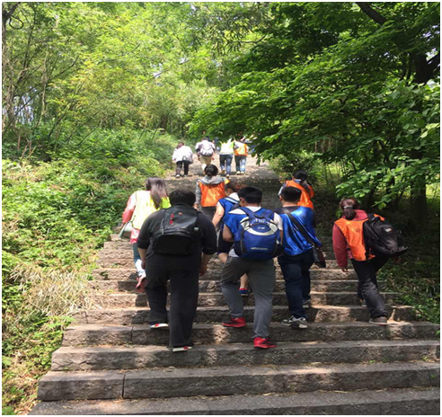 接著全員參與了勇攀高峰環(huán)節(jié),在大自然的懷抱中,輕松愉快的途經狀元廣場、步行臺階,最終登上了老鷹山瞭望塔塔頂。